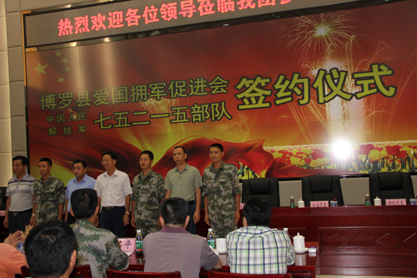 期間,縣愛國擁軍促進會與75215部隊簽約,結(jié)成“友好連隊”,縣愛國擁軍促進會所屬13家企業(yè)與75215部隊所屬25個分隊簽定合約,結(jié)為友好共建單位。羅浮山水泥集團與75215部隊70分隊(工兵連)結(jié)為友好共建單位,并當(dāng)場為工兵連捐款1萬元建籃球場。