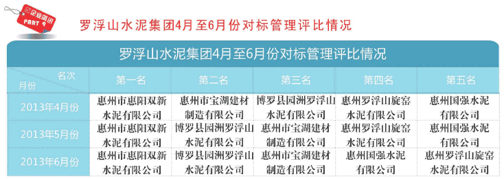 6月22日上午、6月25日至26日, 羅浮山水泥集團常務(wù)副總戰(zhàn)兼財務(wù)總監(jiān)謝偉松、集團辦公室主任李麗華、集團質(zhì)監(jiān)中心主任曾崽平與集團下屬各廠抽派的總經(jīng)理(或副總經(jīng)理),財務(wù)抖長、車間主任、供銷科長、化驗室主任、行政科(組)長分別組成財務(wù)考核小組、生產(chǎn)考核小組、供銷考核小組、化驗室考核小組、行政考核小組,對各廠的對標(biāo)管理工作進行檢查考核。羅浮山水泥集團董事長兼總哉吳國強參加了最后的檢查總結(jié)匯總會。為了使8S管理活動得到扎實有效的推行.完善公司的行政管理制度,集團公司決定: 從2013年第二季度對標(biāo)管理檢查開始增設(shè)行政考核小組,將行政工作指標(biāo)(含88管理)納入對標(biāo)管理季度考核當(dāng)中。